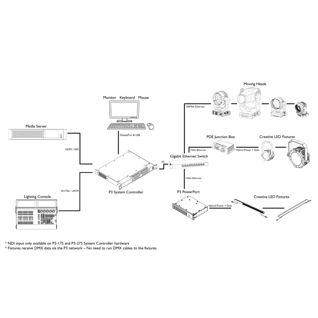 システム全体は完全に同期されており、すべての要素が遅延なく連携して動作します。HDMIおよびNDI入力によるフルHDビデオ入力をサポートし、最大52万ピクセルを最大2,000台の照明器具に出力します。リアルタイムプレビューでは、DMX制御とビデオが照明器具上でどのようにレンダリングされるかを確認できます。